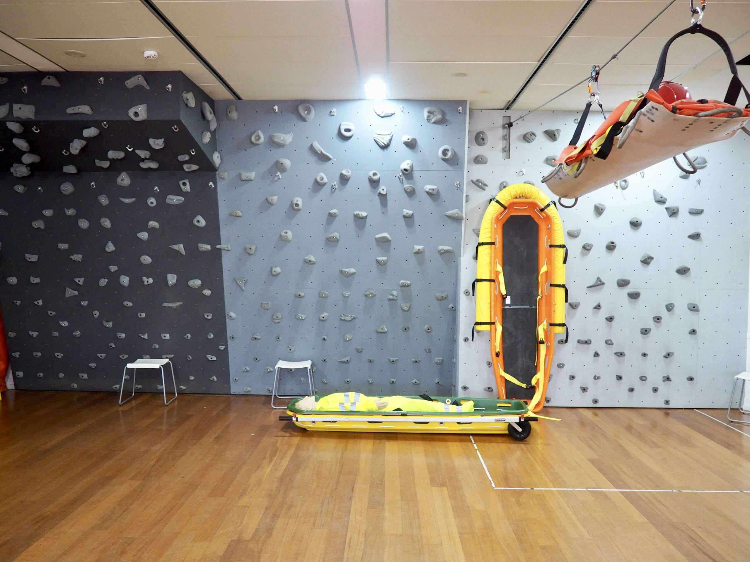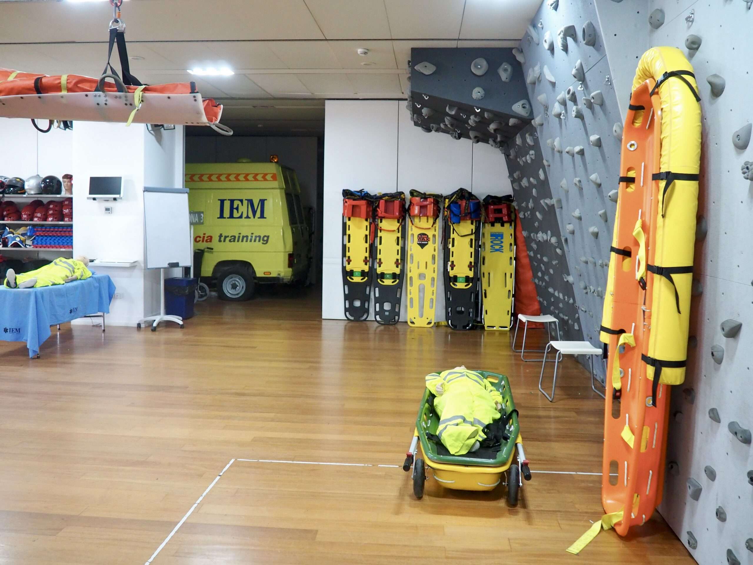 - Estaciones de rescate y atención prehospitalaria: Espacios diseñados para recrear escenarios reales de emergencias, con un rocódromo y boxes de urgencias equipados para prácticas de soporte vital avanzado y paciente crítico en general.